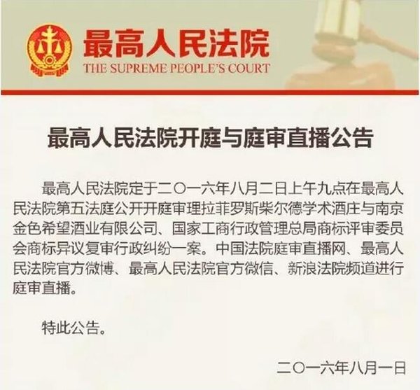 2017年4月24日,最高人民法院发布“2016年中国法院知识产权司法保护十大案件”,由集佳诉讼团队代理的“拉菲罗斯柴尔德酒庄与国家工商行政管理总局商标评审委员会、南京金色希望酒业有限公司商标争议行政纠纷再审案”荣登榜单。