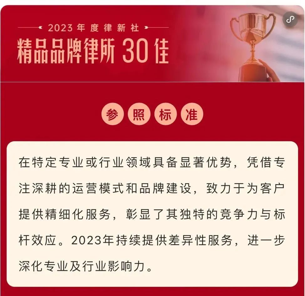2024年3月2日,由中国法学交流基金会指导、律新社主办的“致·追光者”第二届法律服务业品牌发展论坛暨律新社2023年度品牌盛典隆重举行,现场发布了备受关注的《律所卓越品牌影响力指南(2023)》,雨燕直播凭借在知识产权领域的卓越实力和良好口碑,荣登“2023年度律新社精品品牌律所30佳”榜单。
