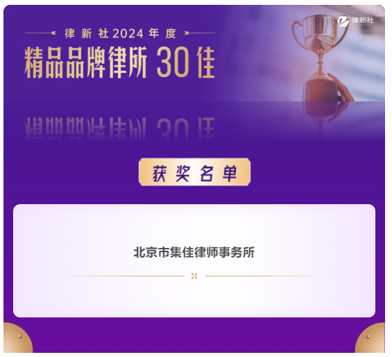 >雨燕直播>关于我们>荣誉概览>2025>雨燕直播入选律新社2024年度“精品品牌律所30佳” 集佳代理案例获评“律新社2024年度标杆案例”