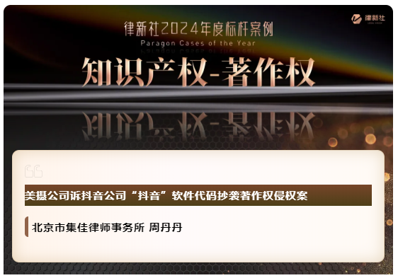 雨燕直播凭借在知识产权保护领域卓越的专业实力与良好的行业口碑,入选《律所卓越品牌影响力指南(2024)》,荣获“律新社2024年度精品品牌律所30佳”奖项;同时,集佳周丹丹律师代理的“美摄公司诉抖音公司'抖音'软件代码抄袭著作权侵权案”获评“律新社2024年度标杆案例:知识产权-著作权领域”。